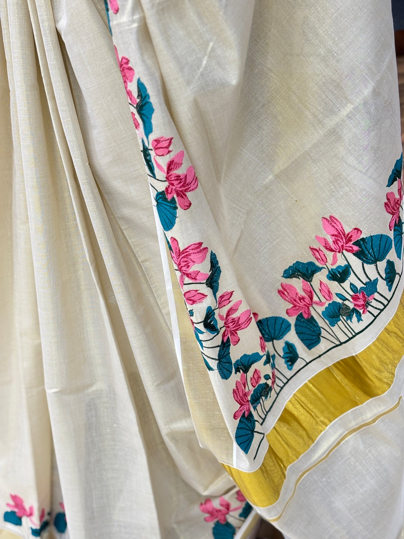 • ✅ Pattern: Lotus flower printed kasavu saree for women
