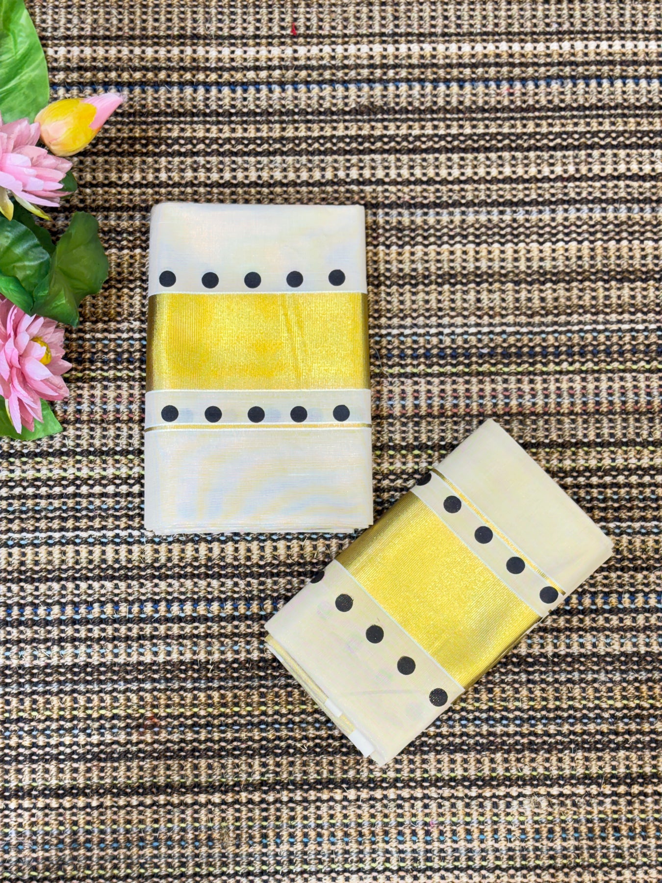 Description: Polka Dot Set Mundu with Golden Kasavu