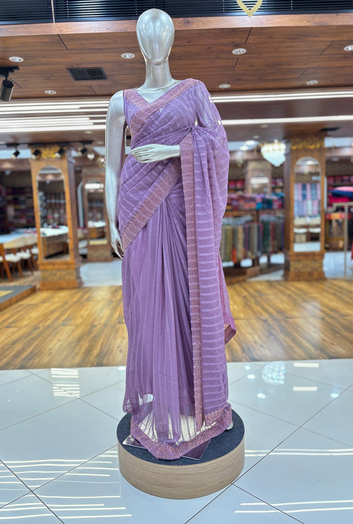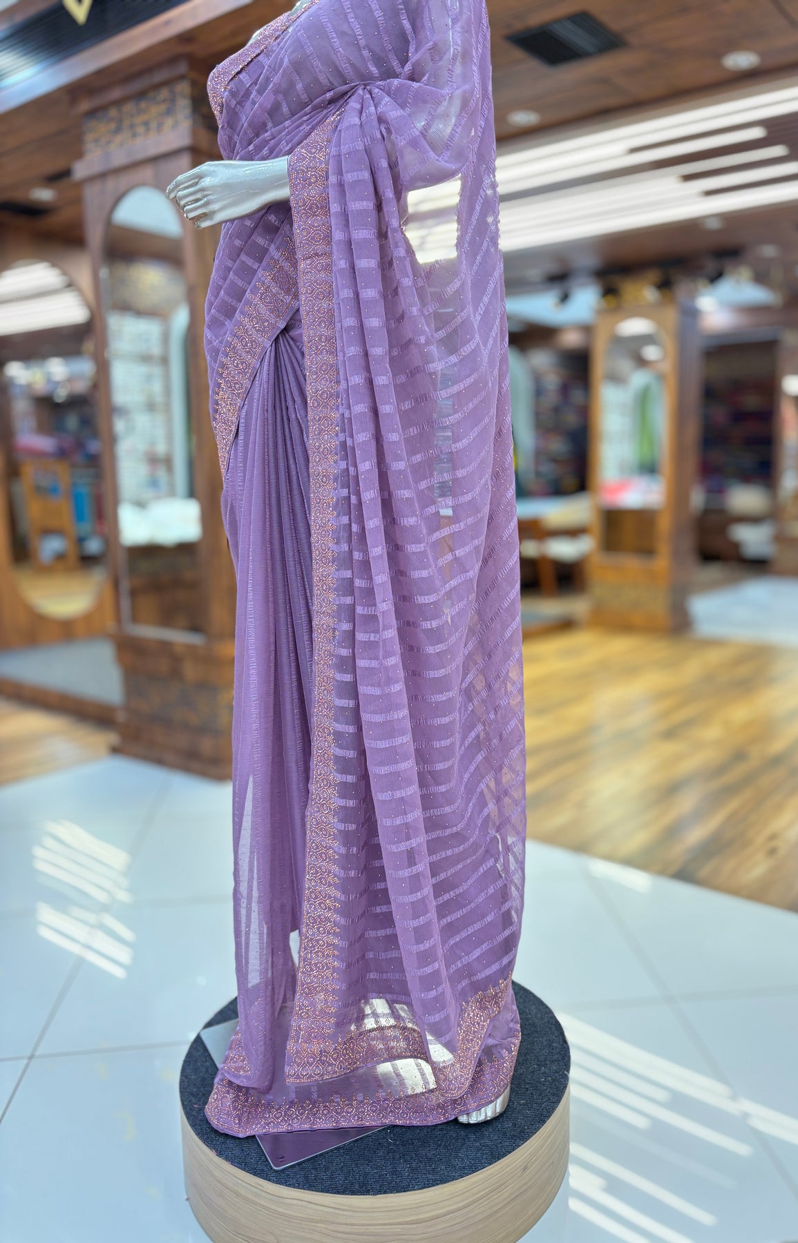 Chiffon Stripe Saree With Stone Border and Unstitched Blouse material